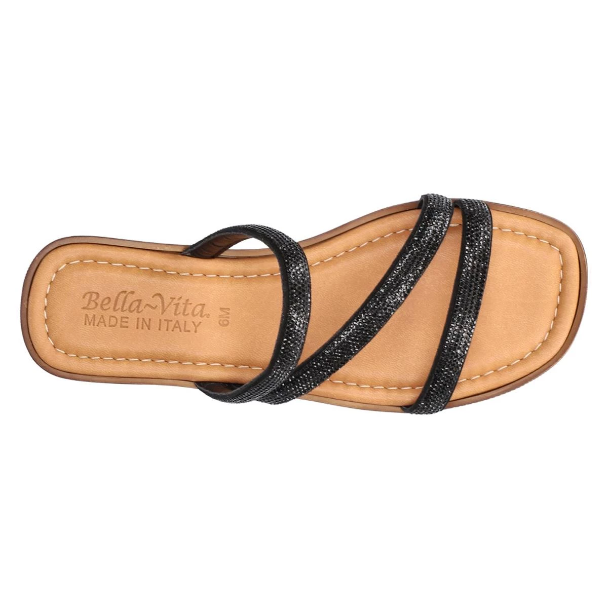 The Womens Bella Vita Ona-Italy sandals shout sophistication with their sparkle and are the perfect pair for any summertime outfit. These minimalistic slides offer an asymmetrical strap design that can easily go from the pool side to a party. Designed on a lightweight platform, the padded heel to toe insole will give you all the comfort you need to take on the day.Also available in Narrow and Wide Widths.