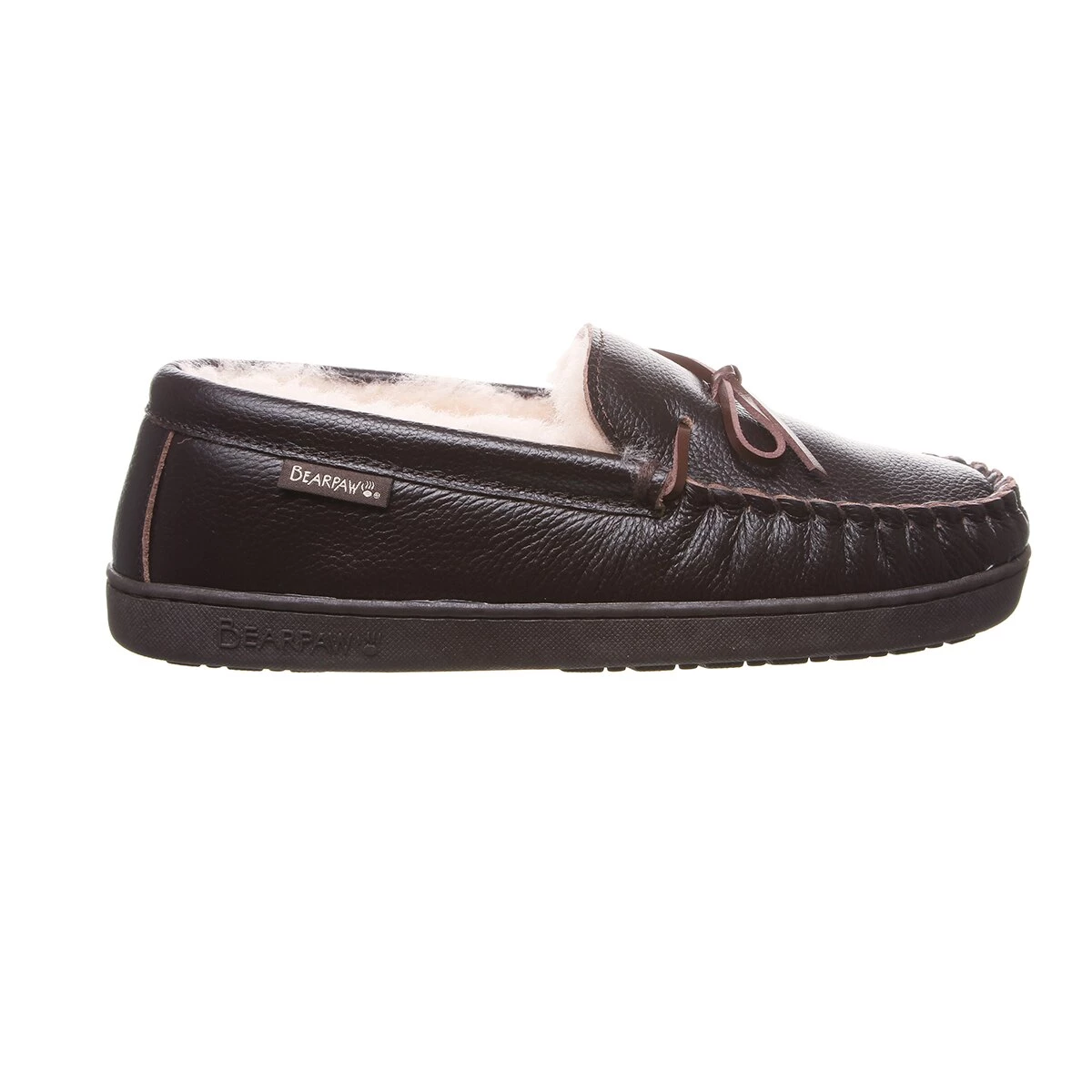 Treat your feet with these Mens BEARPAW® Mach IV wide slippers. Featuring a full grain leather upper, moc toe stitching with leather lace, sheepskin lining, a comfortable sheepskin footbed, and durable TPR outsole.