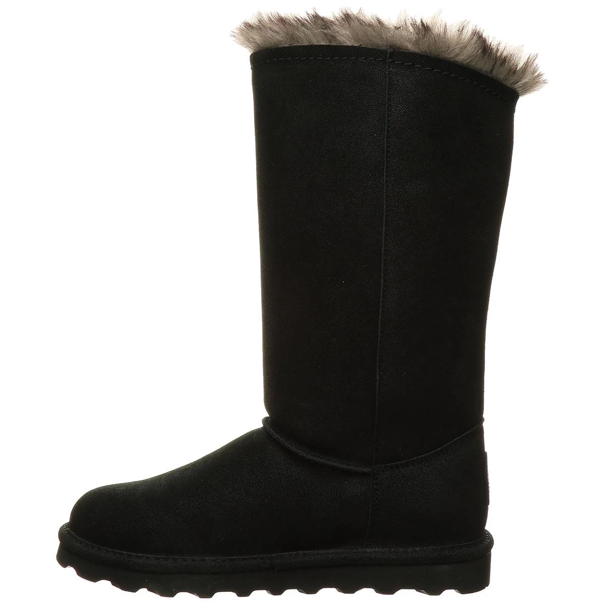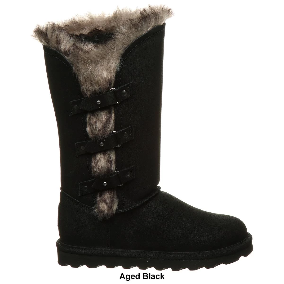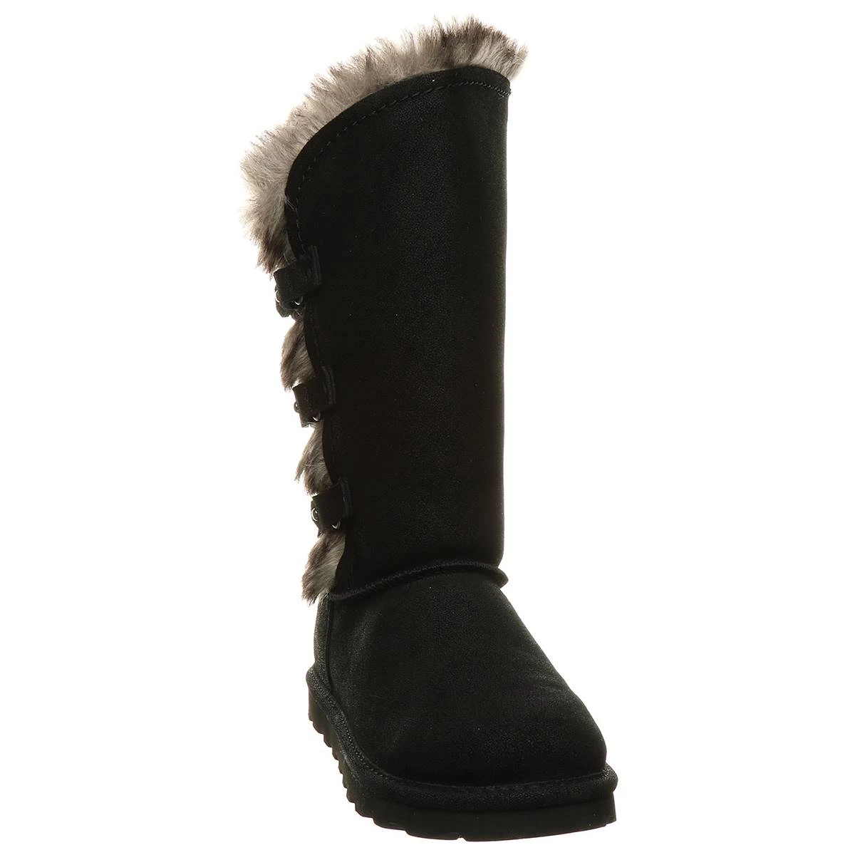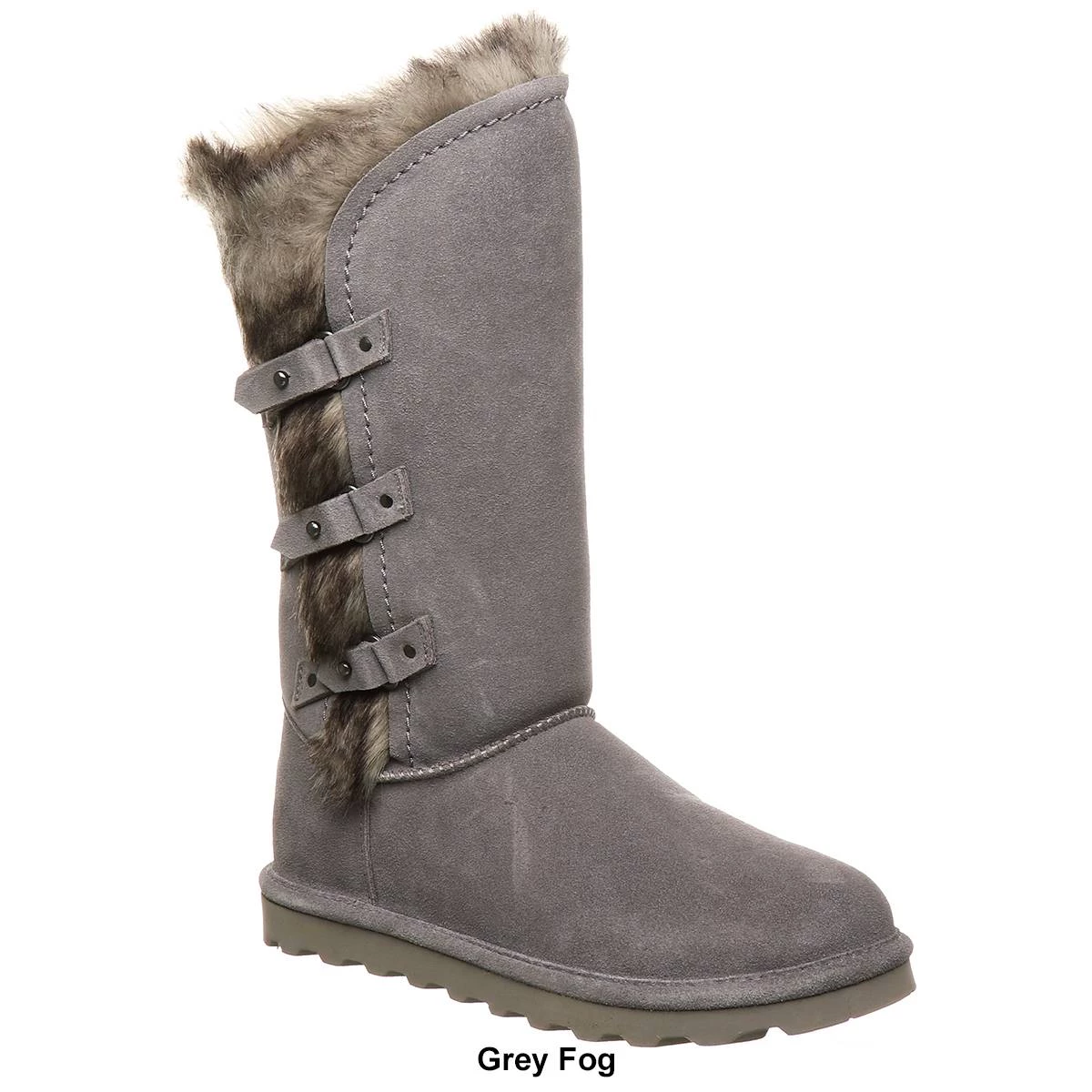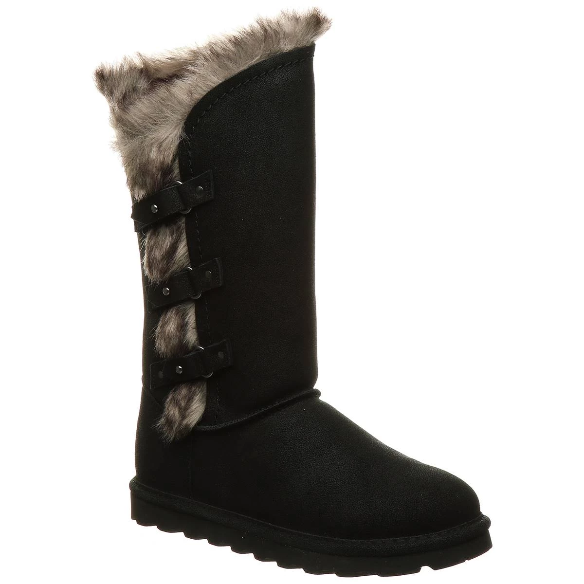 Make a statement with these cozy Womens BEARPAW® Emery tall boots. Adorned with three decorative strap detail, cow suede upper, and a faux fur collar accent. Treated with NeverWet® technology for extra protection from the elements.
