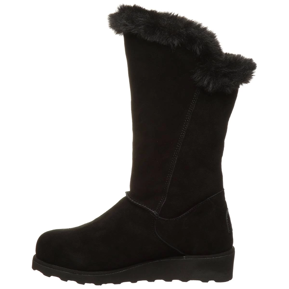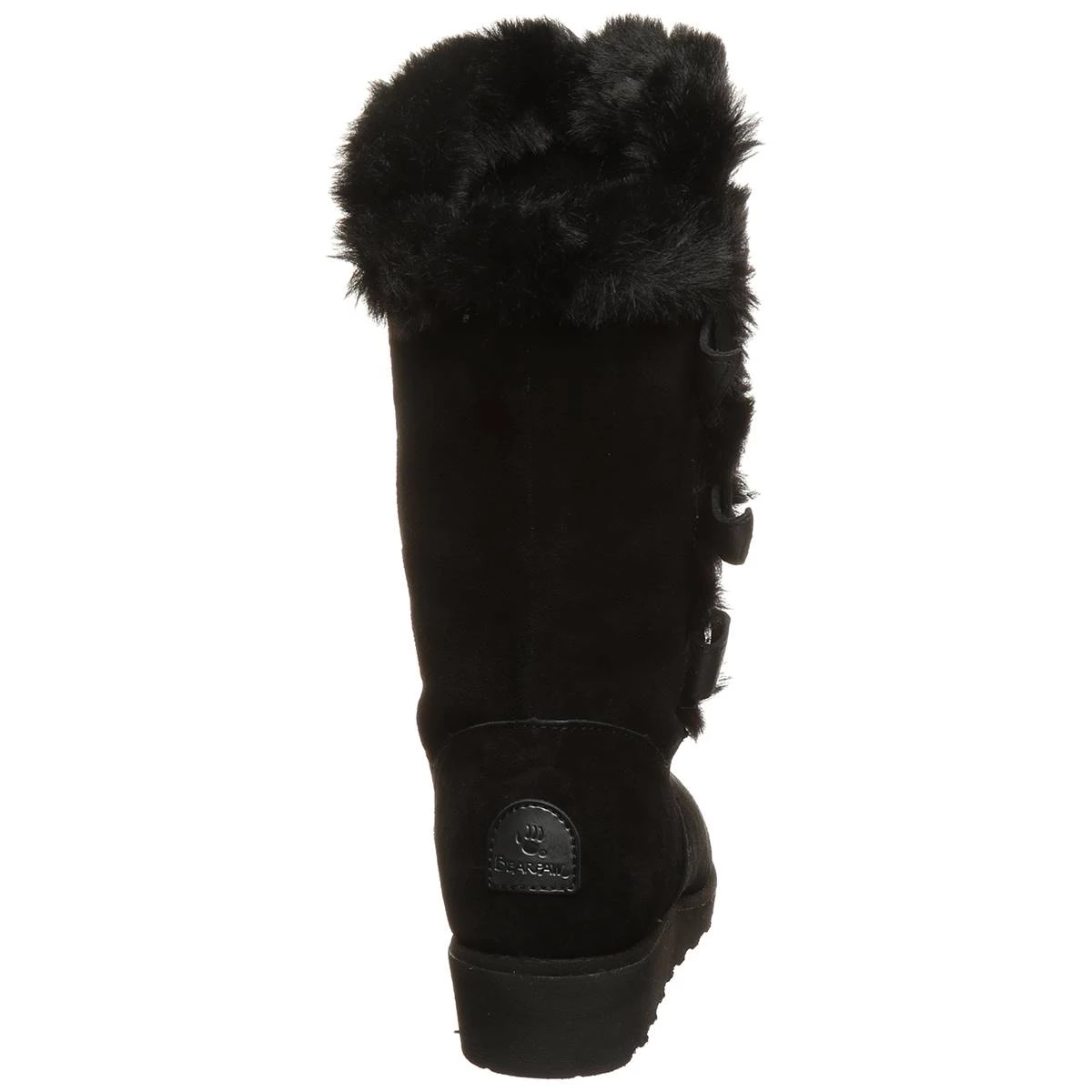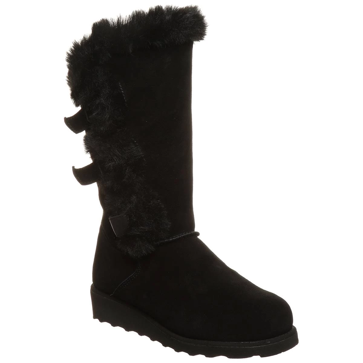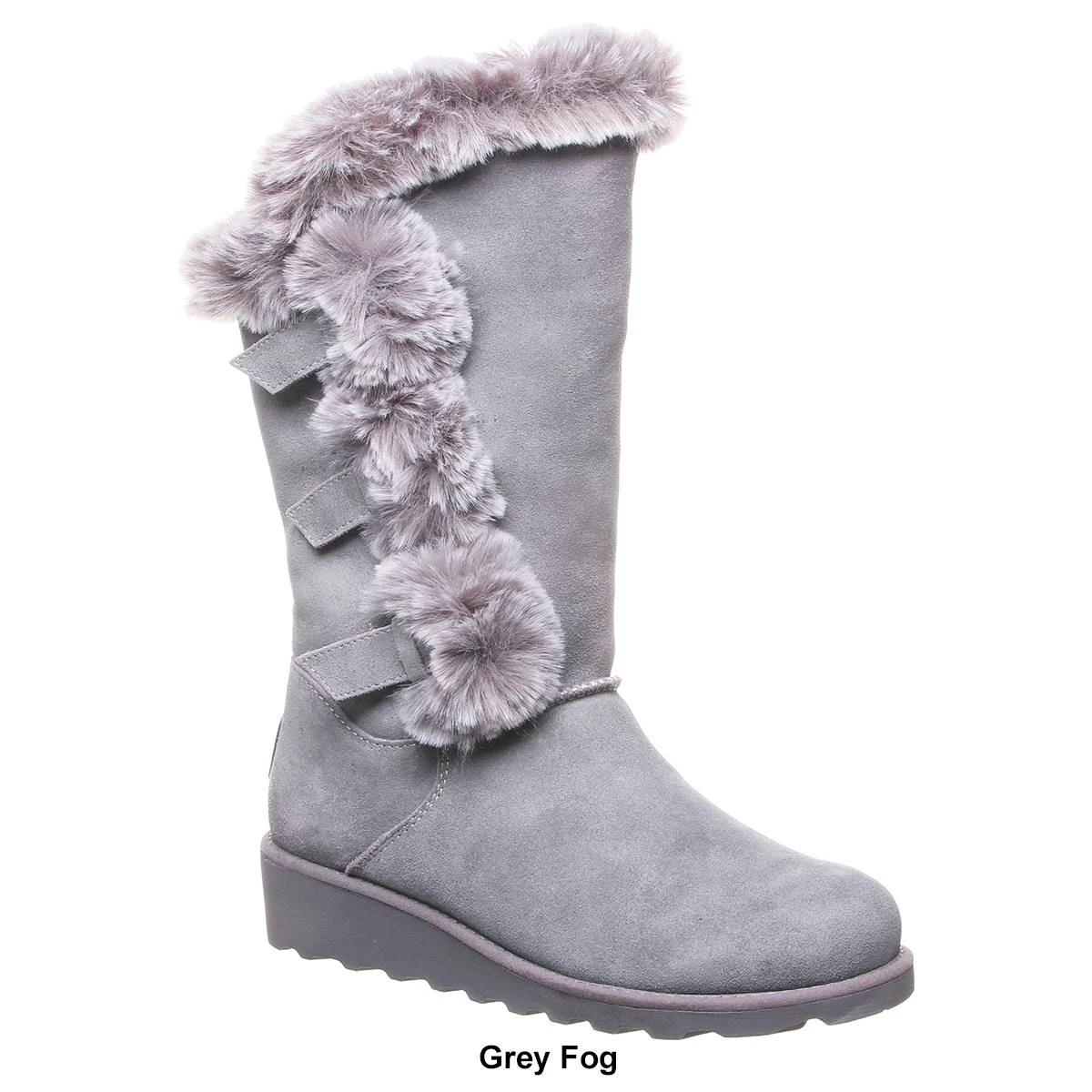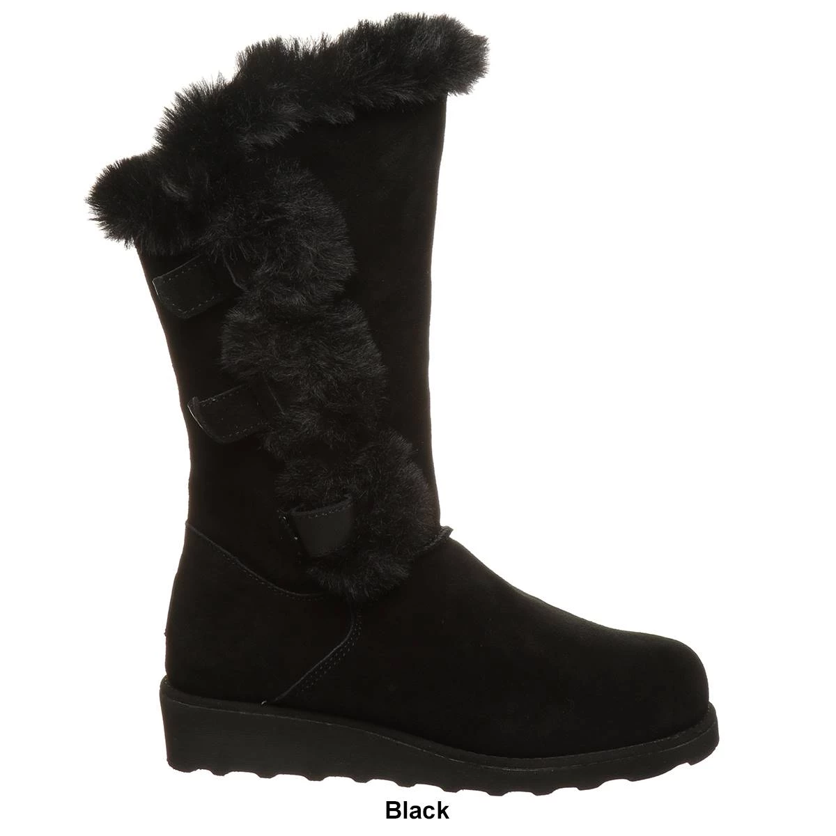 A touch of fluff gives detail and interest to these Womens BEARPAW® Genevieve cozy tall boots. Featuring cow suede with faux fur upper, wool blend lining, removable comfort sheepskin footbed, and lightweight rubber outsole. Accented with a triple buckle with fur wrapped and elevated heel boot is designed to spruce up any fall wardrobe. Treated with Neverwet® technology to keep your feet dry.